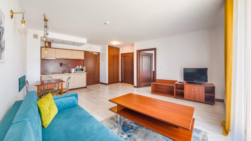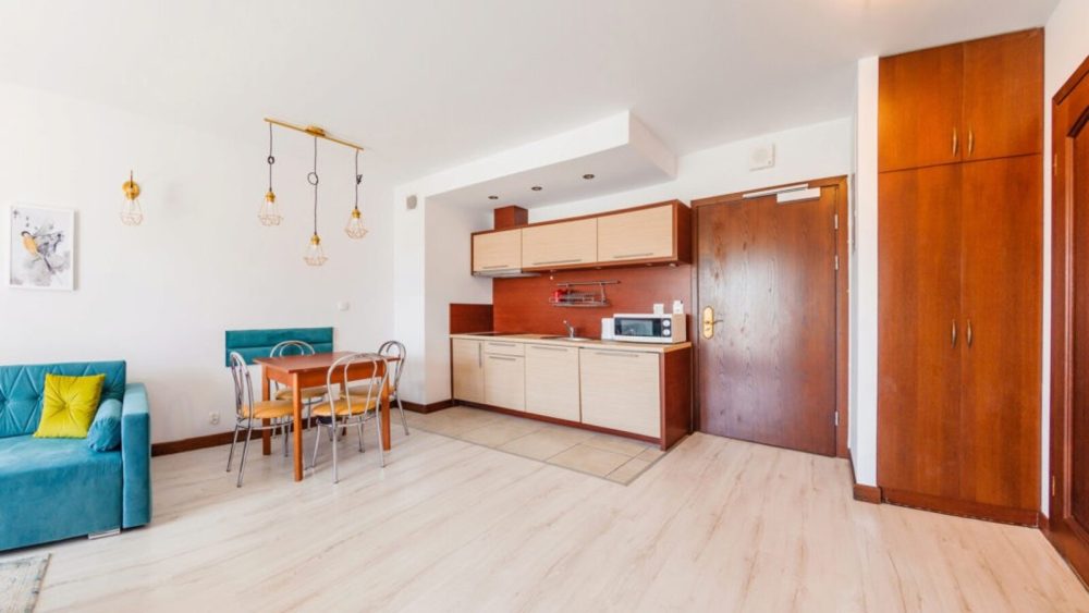 Rozkład: oddzielna sypialnia, salon z aneksem kuchennym, balkon oraz łazienka.